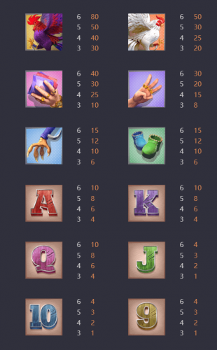 ตีนไก่ หากสะสมได้ 3, 4, 5, 6 อัน จะได้รับอัตราการจ่ายตามลำดับ 6, 10, 12, 15